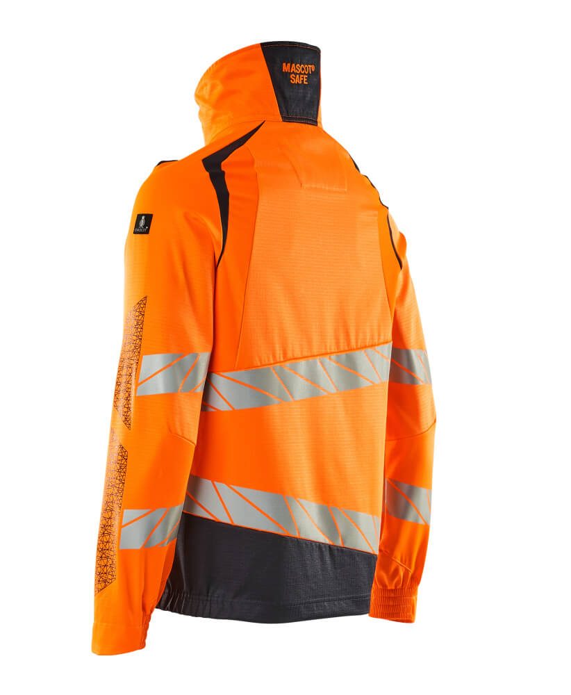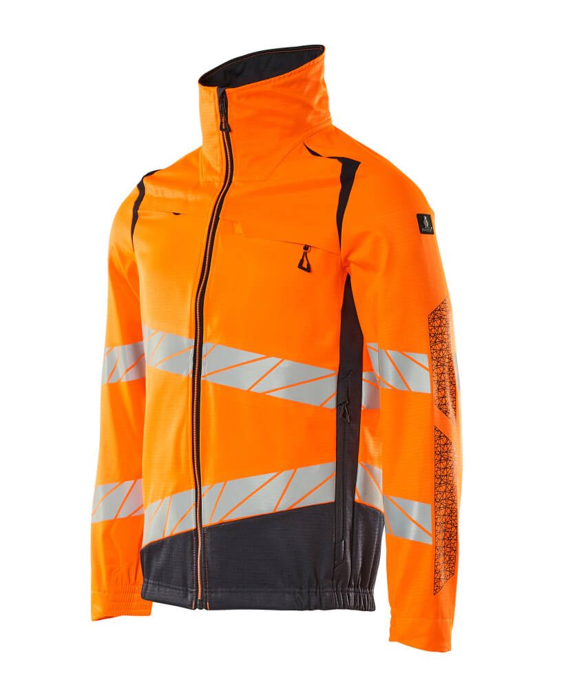 Fluorescējoša ar slīpām, šķērseniskām atstarojošām sloksnēm. Izstiepts audums uz izstrādājuma daļām. Viegla auduma kvalitātes 236 un ULTIMATE STRETCH kombinācija auduma kvalitātē 511. Divu toņu. Augsta apkakle. Aizdare ar rāvējslēdzēju un iekšējo vētras atloku. D veida gredzens. Krūšu kabata ar rāvējslēdzēju. Priekšējās kabatas ar rāvējslēdzēju. Iekšējās kabatas. Sānos un jostasvietā elastīga. Elastīga pie aproces. Ar drukas efektiem.