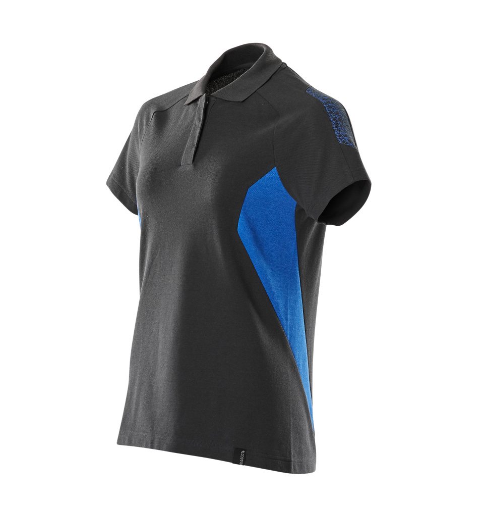 Premium Performance. Dāmas der. Spēcīga kvalitāte. Rievota apkakle. Plāksne ar slēptām pogām. Kakla lente. Apdruka uz apģērba daļas.
