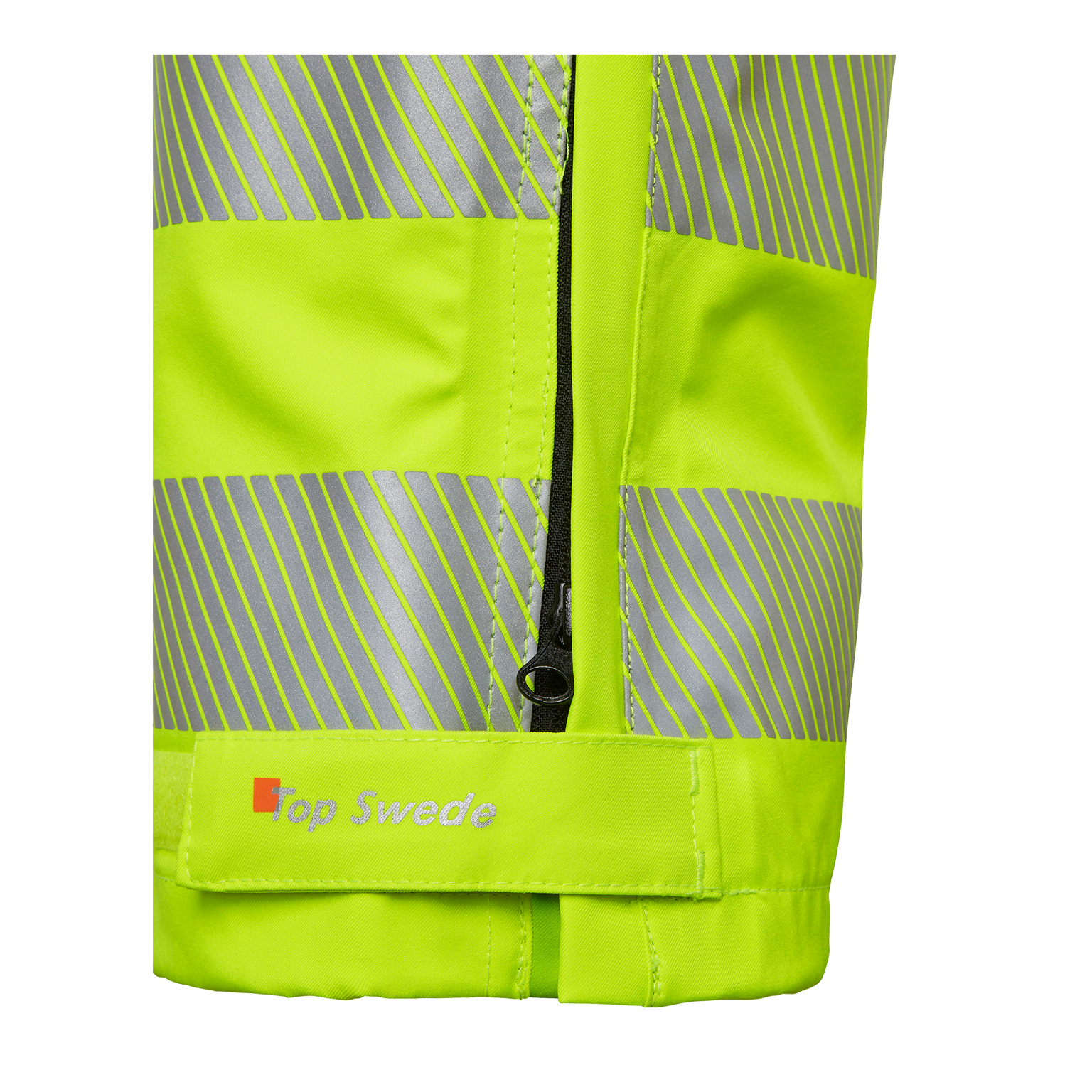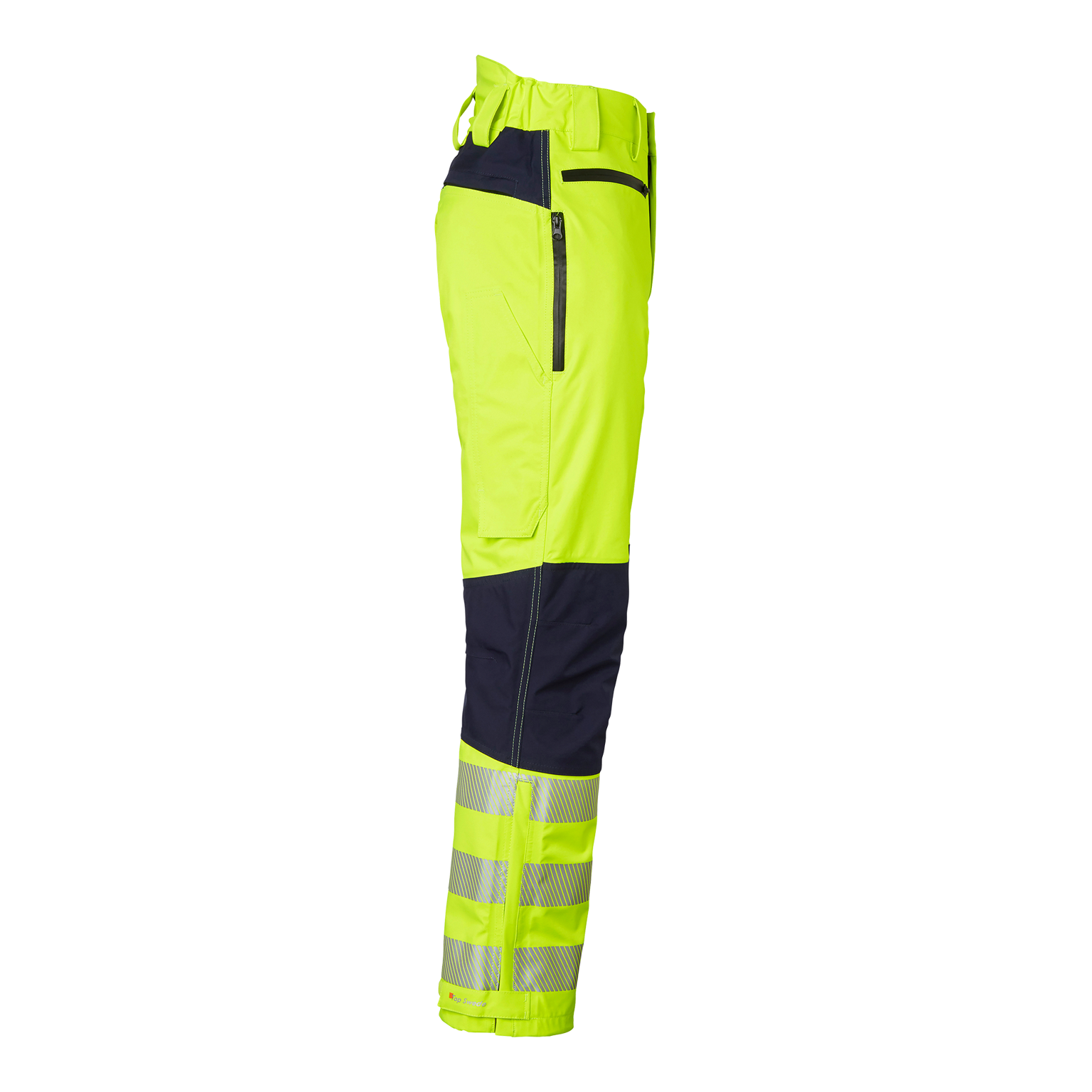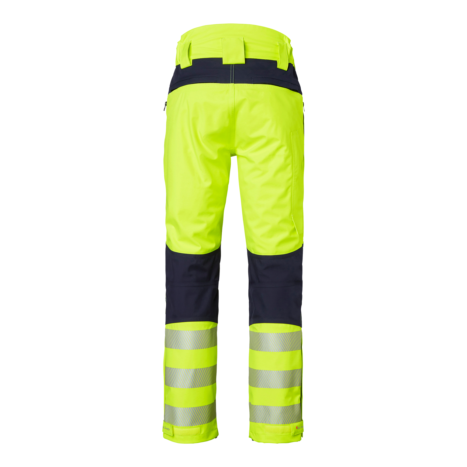 Vēja un ūdensnecaurlaidīgas apvalka bikses no 3 slāņu materiāla ar elpojošām un līmlentām šuvēm. Izstrādāts un izstrādāts, lai sasniegtu maksimālu komfortu un funkcionalitāti. Viduklis ar paaugstinātu muguru un elastīgu gumiju, lai nodrošinātu vislabāko piegulšanu. Jostu sprādzes. Divas priekšējās atveres ar ūdensizturīgiem rāvējslēdzējiem pakarināmām kabatām. Divas priekšējās kabatas ar ūdensnecaurlaidīgām ķēdēm. Divas aizmugurējās kabatas ar slēptu rāvējslēdzēju, lineāla kabata ar drenāžu. Prebent kājas. Regulējams kāju gals ar velcro un rāvējslēdzēju līdz celim. Ūdens stabs >10 000mm, elpojamība 5000g/m². EN ISO 20471 2. klase.